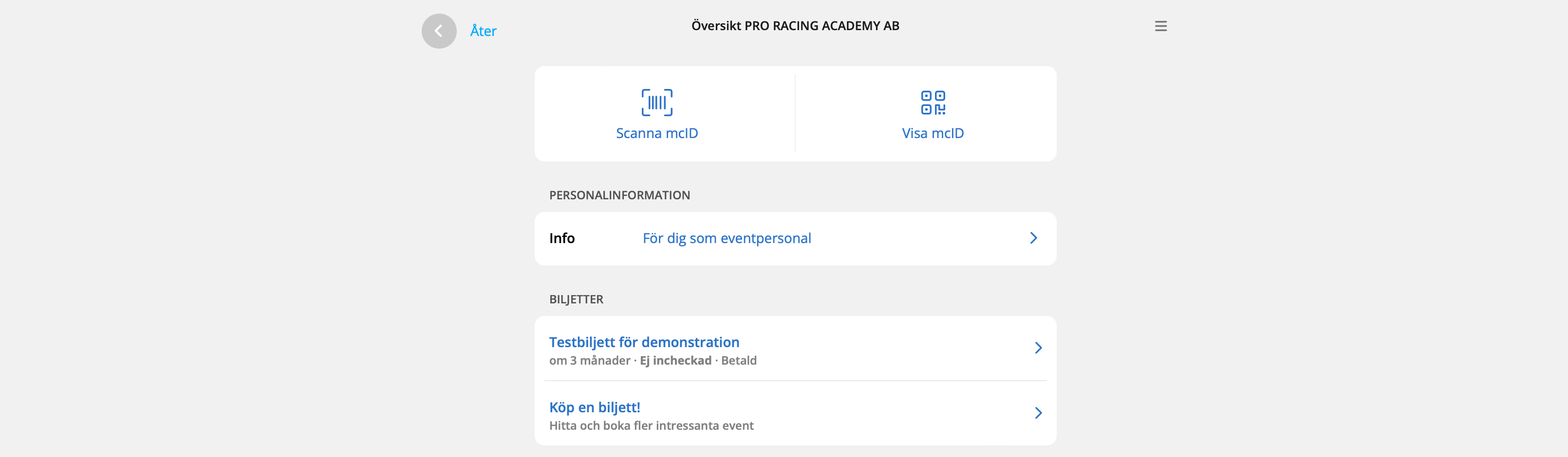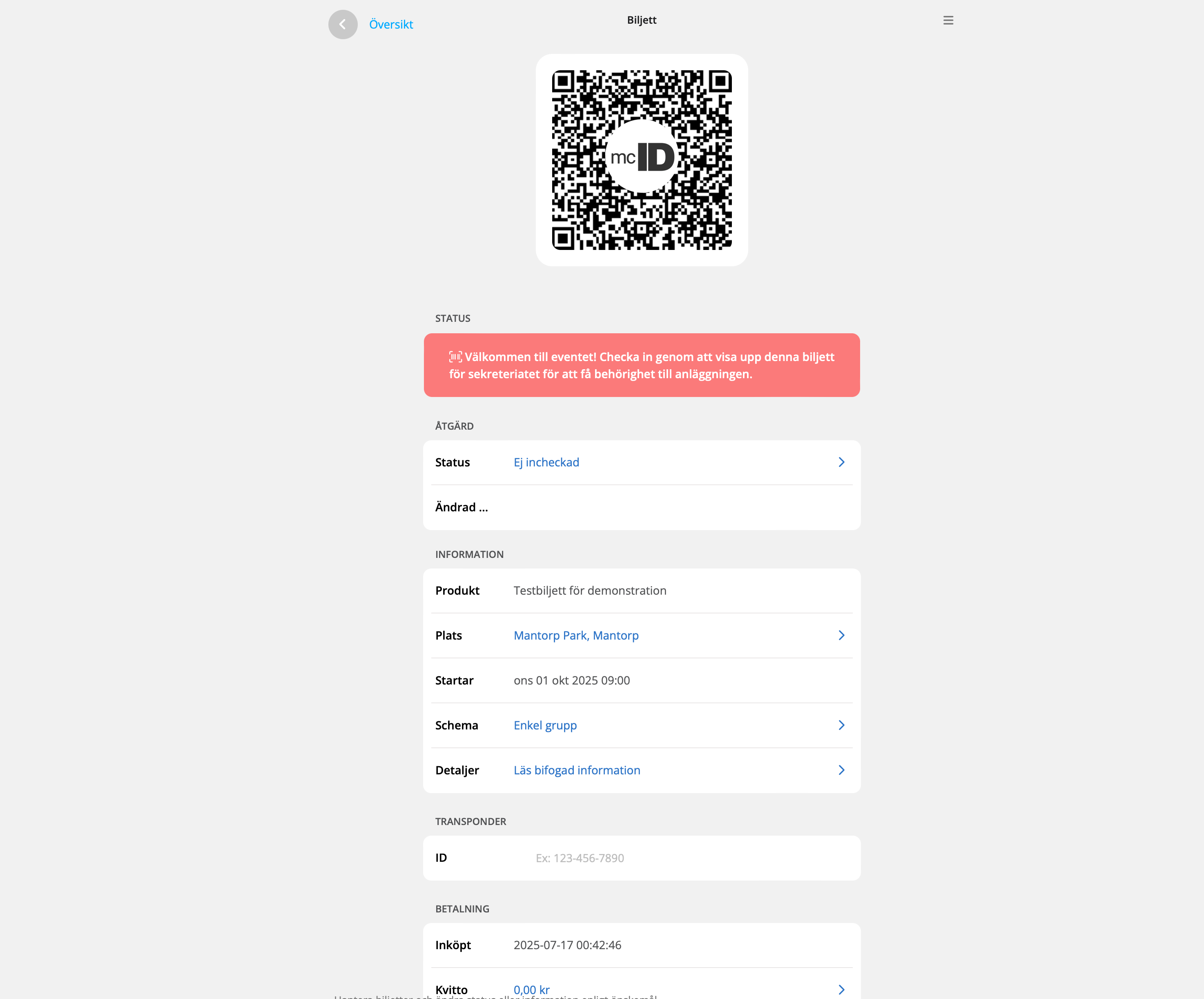 Här är exempel på kundens biljett som innehåller status, vart eventet är, vilket schema/grupp de kör i och där också information om tider och liknande samt detaljer som leverantören berättar lite extra om. Här kan också kunden överlåta sin biljett till någon annan, se betalningskvitto eller betala återstående belopp om biljetten inte är betald till fullo.