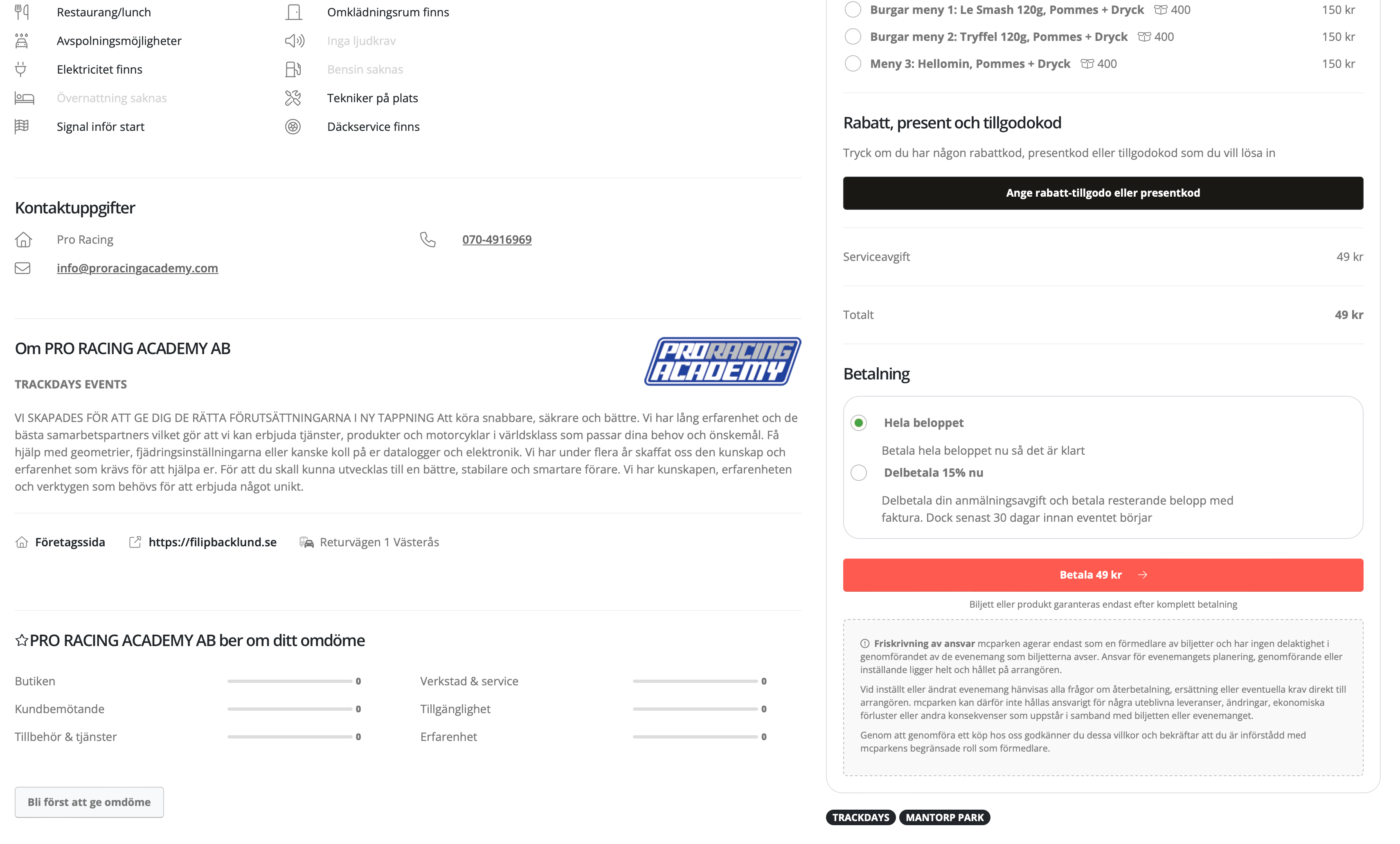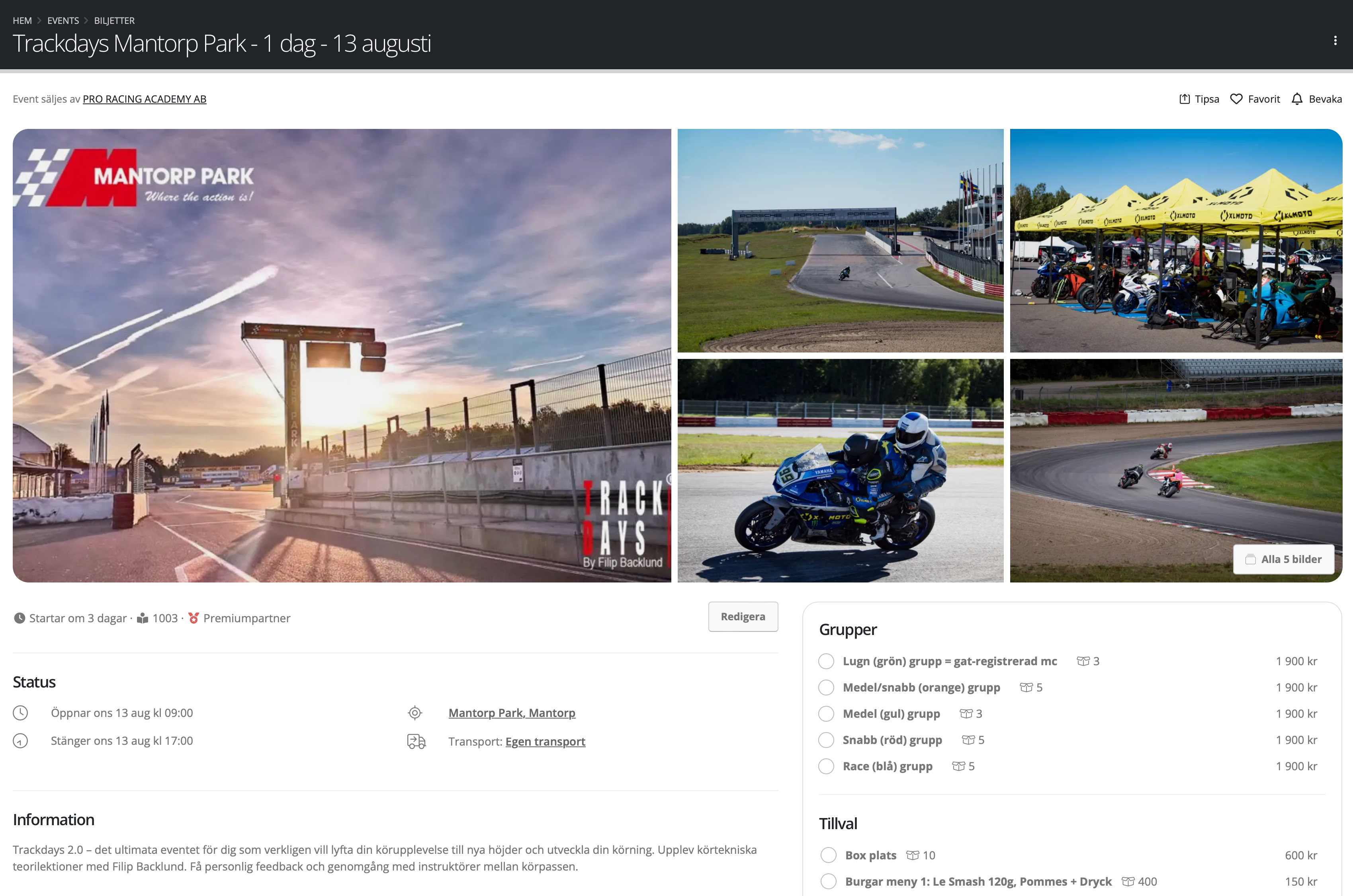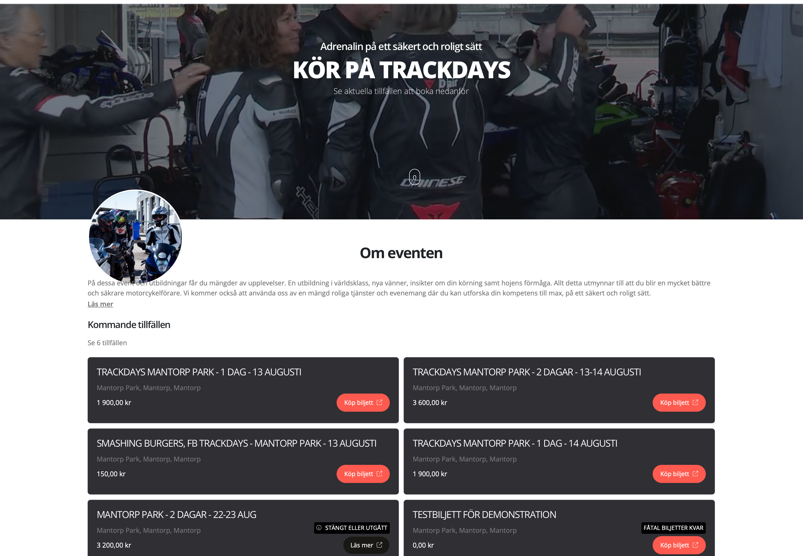 Du kan titta hur det ser ut just nu. Om det inte finns några aktuella biljetter, så kommer du bara se introduktionstexten och den rullande videon som du kan ha för att attrahera fler kunder att vilja köpa era tjänster. Se https://mcparken.se/boka/trackdays