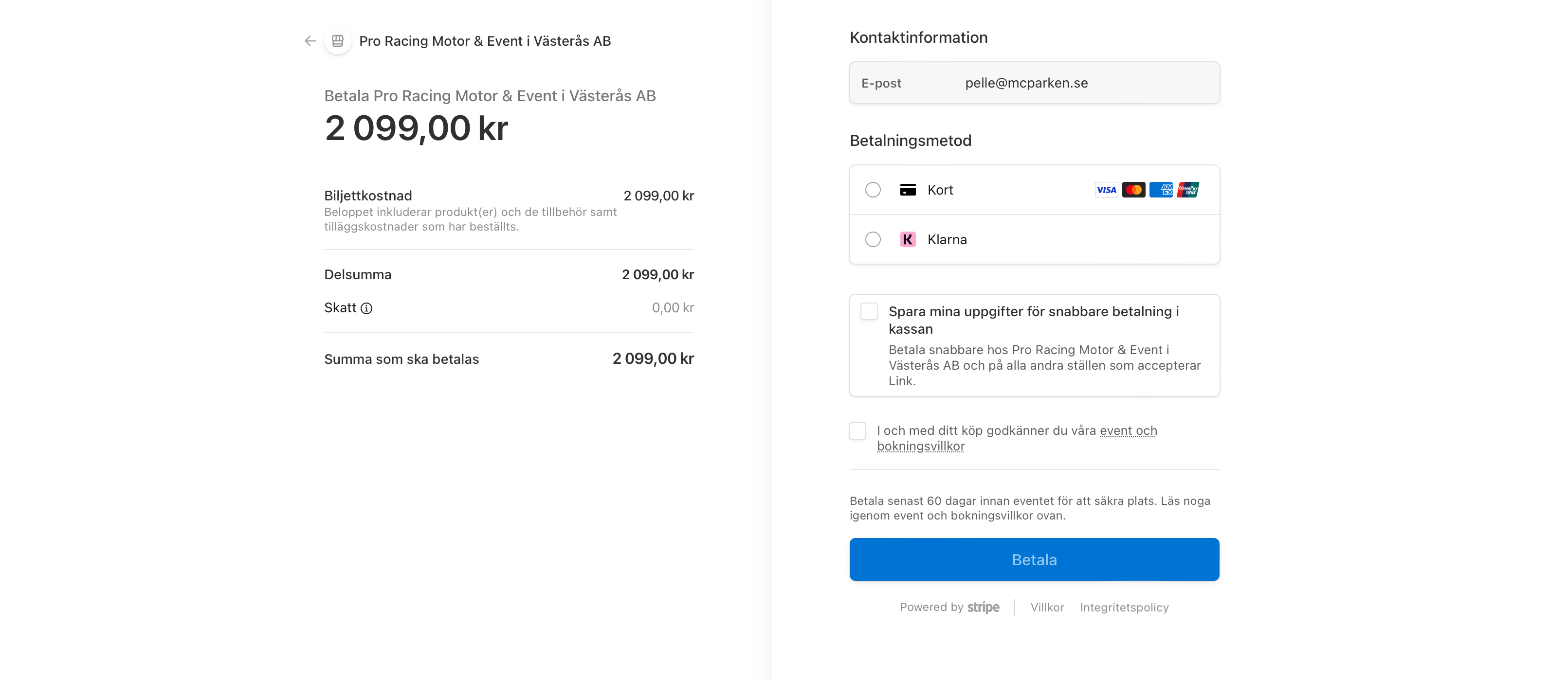 Med hjälp av tjänsten Stripe så kan du erbjuda betalning både med Konto/kreditkort, avbetalningsplan med Klarna samt via Swish. Du kan också erbjuda en delbetalning helt utan extra kostnad, exempelvis betala 20% nu och resten en månad innan eventet börjar. På så sätt får kunden flera möjligheter att hantera den ekonomiska biten själv.