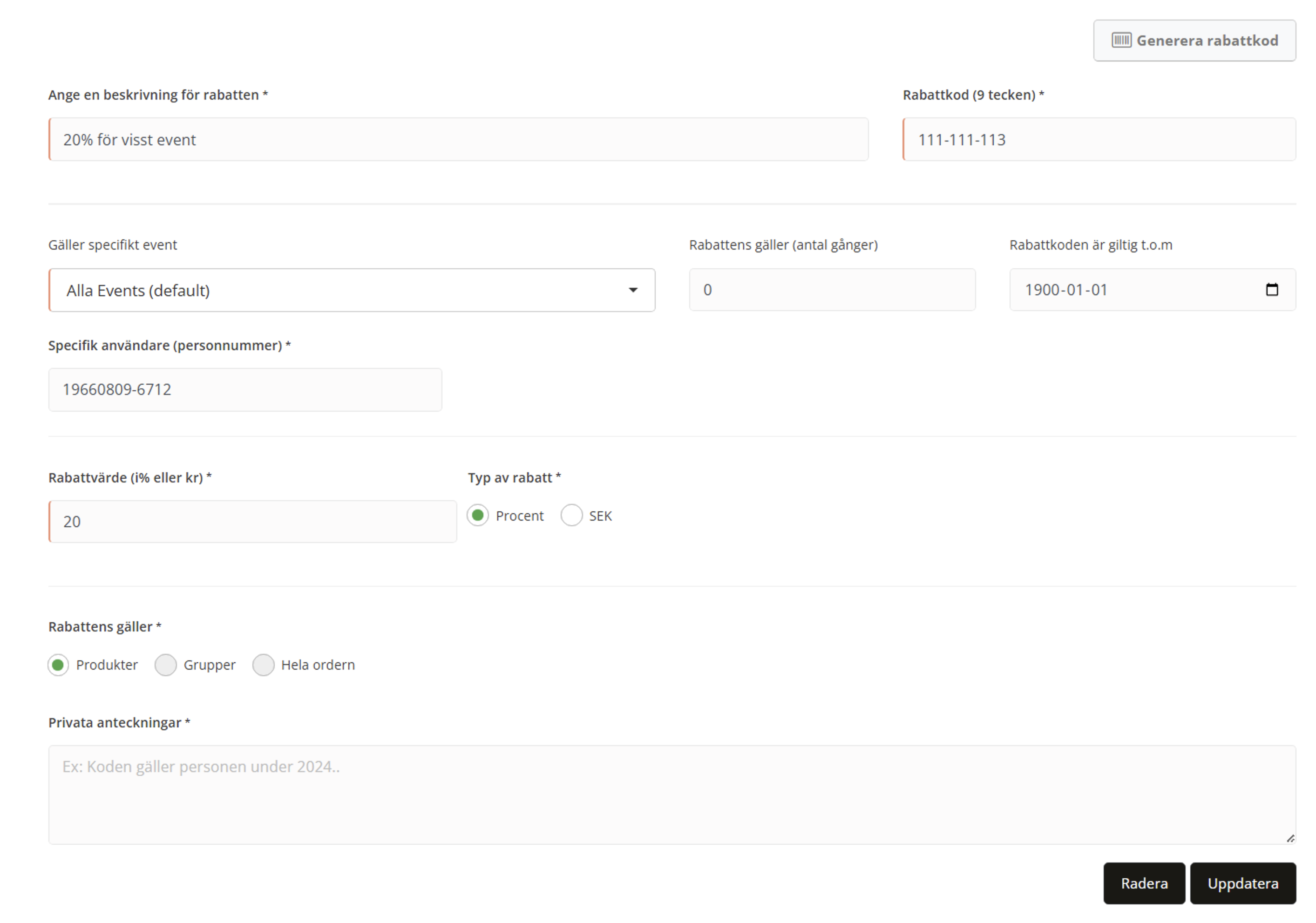I dropdown-listan "Alla events" kan du lämna blank om det gäller alla events. Du kan också bocka i vilket eller vilka events koden skall gälla för. Du kan också ange antal gånger den kan användas, och/eller hur länge koden är giltig. Alla dessa kombinationer kan användas fritt. I fältet specifik användare så anger du kundens personnummer. På så sätt fungerar bara rabattkoden för just den person som är inloggad med aktuellt personnummer vid köpet.