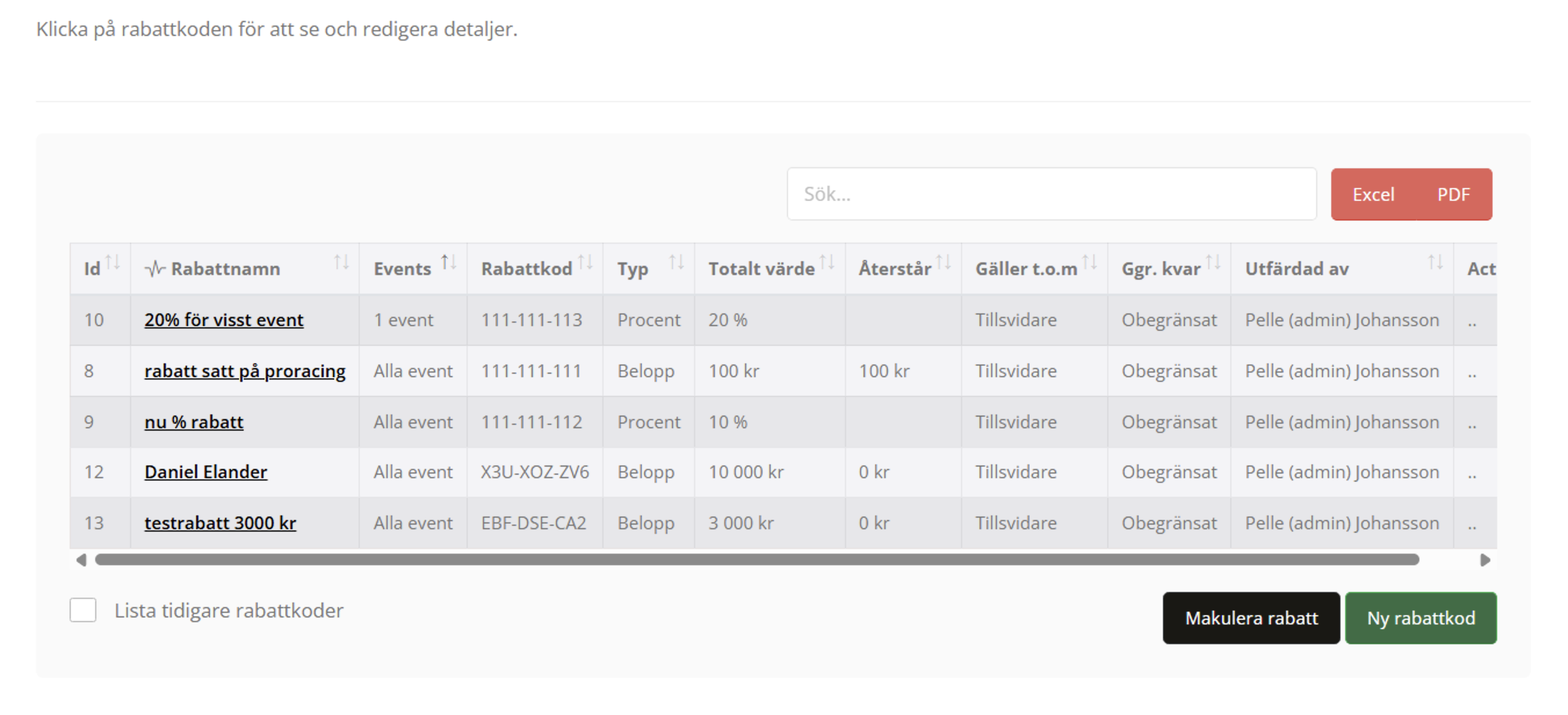 För vissa event och tillfälligheter kan det behövas en eller flera rabattkoder. Här kan du skapa, underhålla och justera rabattkoder som användas under eventen. Det finns en stor variation av alternativ som kan anges:
