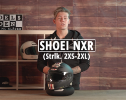 Här ses en Shoei NXR-hjälm som är en ersättare till XR-1100. Det är en enklare form av hjälm där skyddet är tvättbart och spännet är av sportmodell. Den för förberedd för ett intercom-system. Ventilation finns fram och uppe på huvudet och en kanal som släpper ut värmen. Det finns 23 olika grafiska motiv och det finns i alla storlekar.