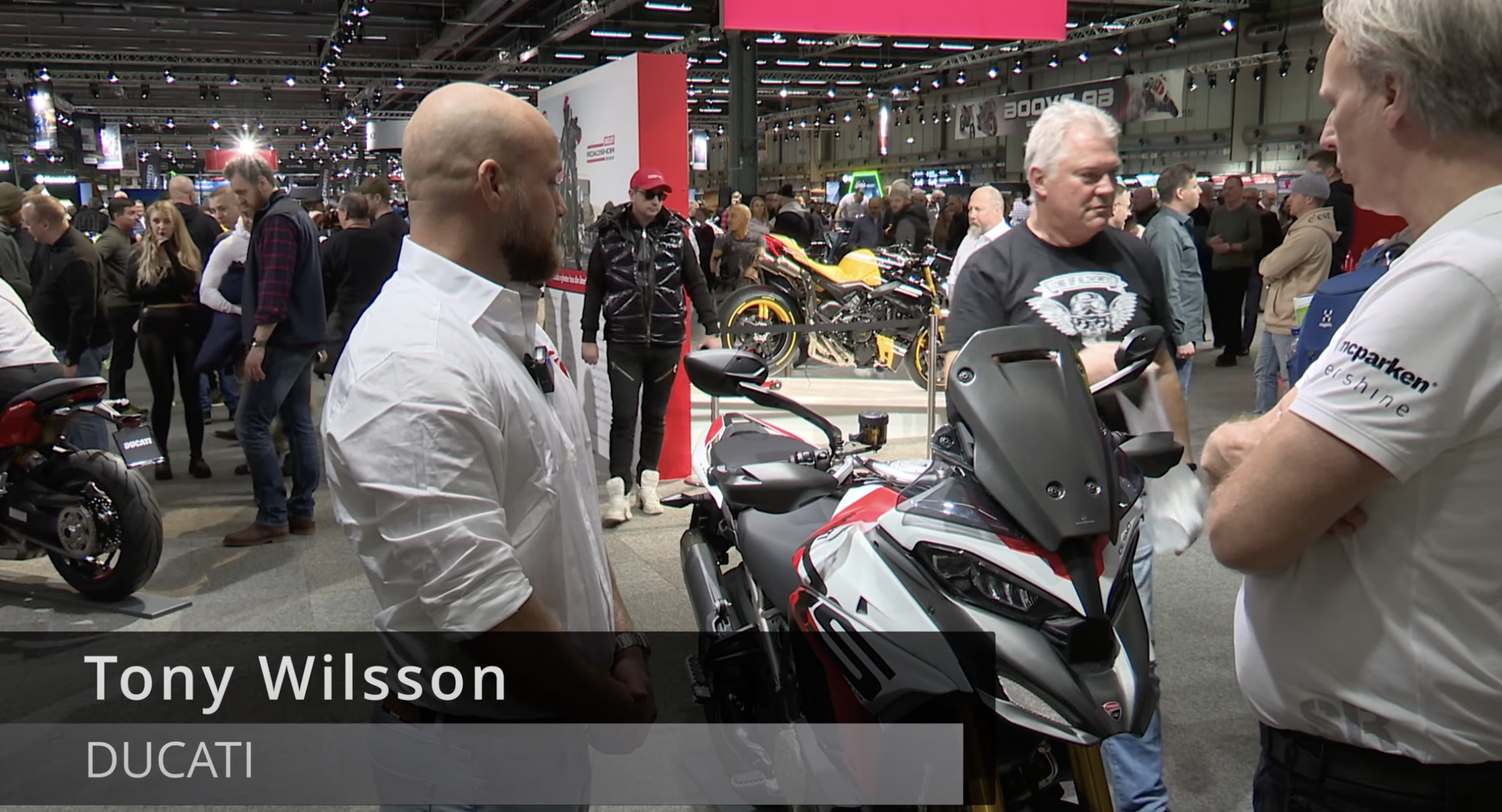 Tony Wilsson som till vardags jobbar på Bike i Trollhättan hjälpte på mässan till och presentera årets nya Ducati Multistrada RS 2024, en fantastisk maskin som vi gärna lyssnar lite på vad den innehåller för trevliga saker. Om ni ska köpa Ducati så har vi flera handlare i Sverige som säljer dessa fina maskiner, ni kan hitta de bland våra annonser.