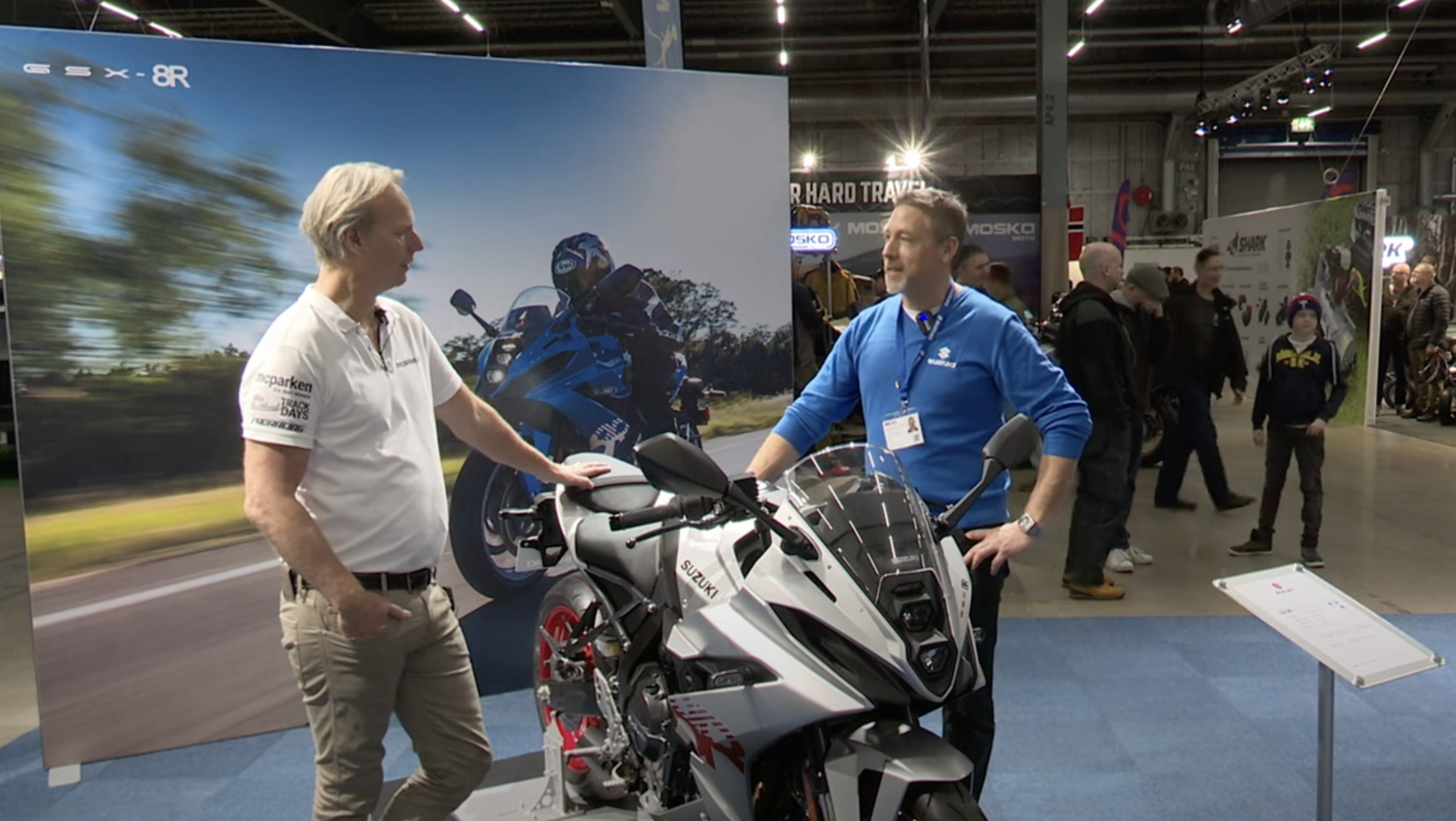 Rasmus Östlund, inköpsansvarig för Suzuki som presenterar några av de nya modellerna såsom GSX-S 8R för 2024. Under flera år har det inte varit så många nya modellen men de två senaste åren så kommer det mer och mer vilket är väldigt positivt för marknaden.