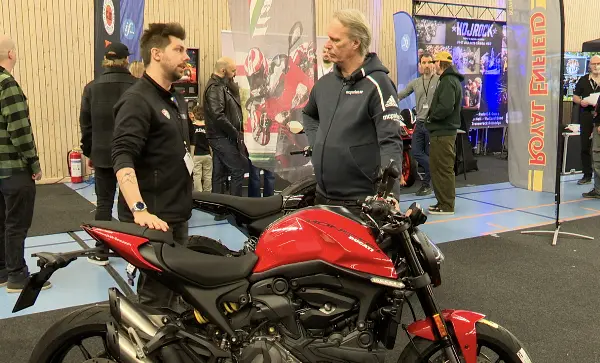 Här presenterar Douglas en Ducati Monster 2025 års modell på mc-mässan i Uppsala. Här berättar han om modellen som är en av ikonerna från Ducati, givetvis fullsmetad med spännande tillbehör som erbjuds.