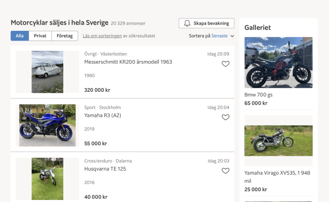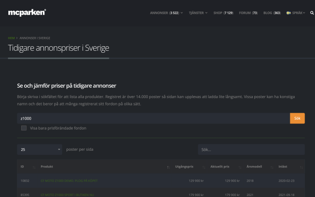 På mcparken började vi för två år sedan att samla in annonser för att i framtiden försöka oss på något så trevligt som att se trenden på vad en viss modell av motorcykel har sålts för tidigare. Tyvärr kan vi inte se vad slutpriset blev, men utgångspriset har vi sparat undan. Med det sagt, här kan du söka efter en viss modell som du är intresserad av för att se va
