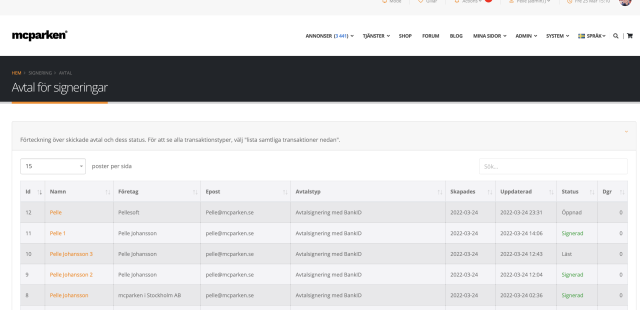 I dag släpptes en första beta-version av signering för avtal. Du som handlare skickar ofta ut avtal för påskrift, nu är det enklare än någonsin att göra detta. Allt du behöver är kundens epost-adress, därefter signerar de med Mobilt BankID och båda parter gör klart avtalet på bara någon minut. Den första handlare som kommer börja använda tjänsten är Alexander på JohansMC som